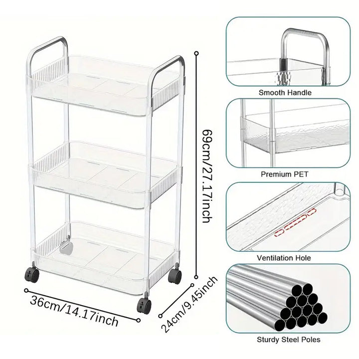 Tier Acrylic Trolley Storage Rack with Wheels | Clear Rolling Organizer Cart for Home
